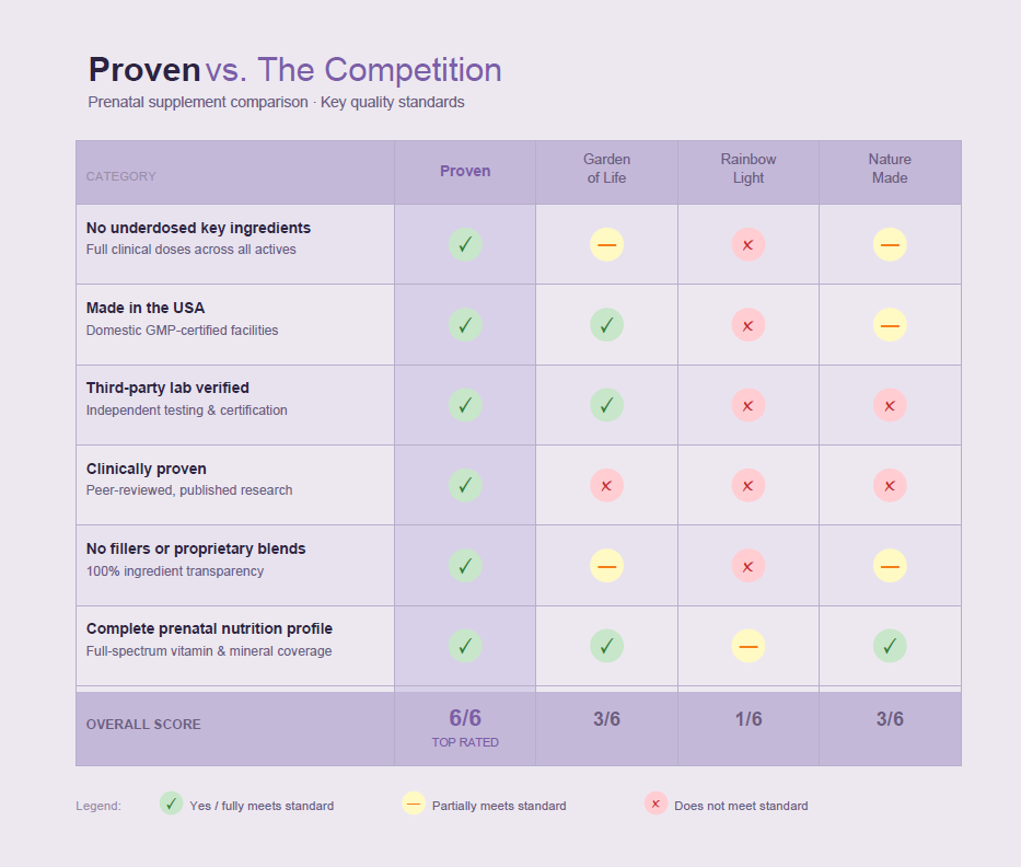 Proven was founded on a simple but powerful belief: that every mother and father who wants to start a family deserves to do so backed by real evidence — not marketing claims. That means clinically validated ingredients at the doses the research actually supports, a complete nutritional profile designed to optimize fertility, maternal wellbeing, and the healthy development of a growing baby — and full transparency into every single thing you're putting in your body.